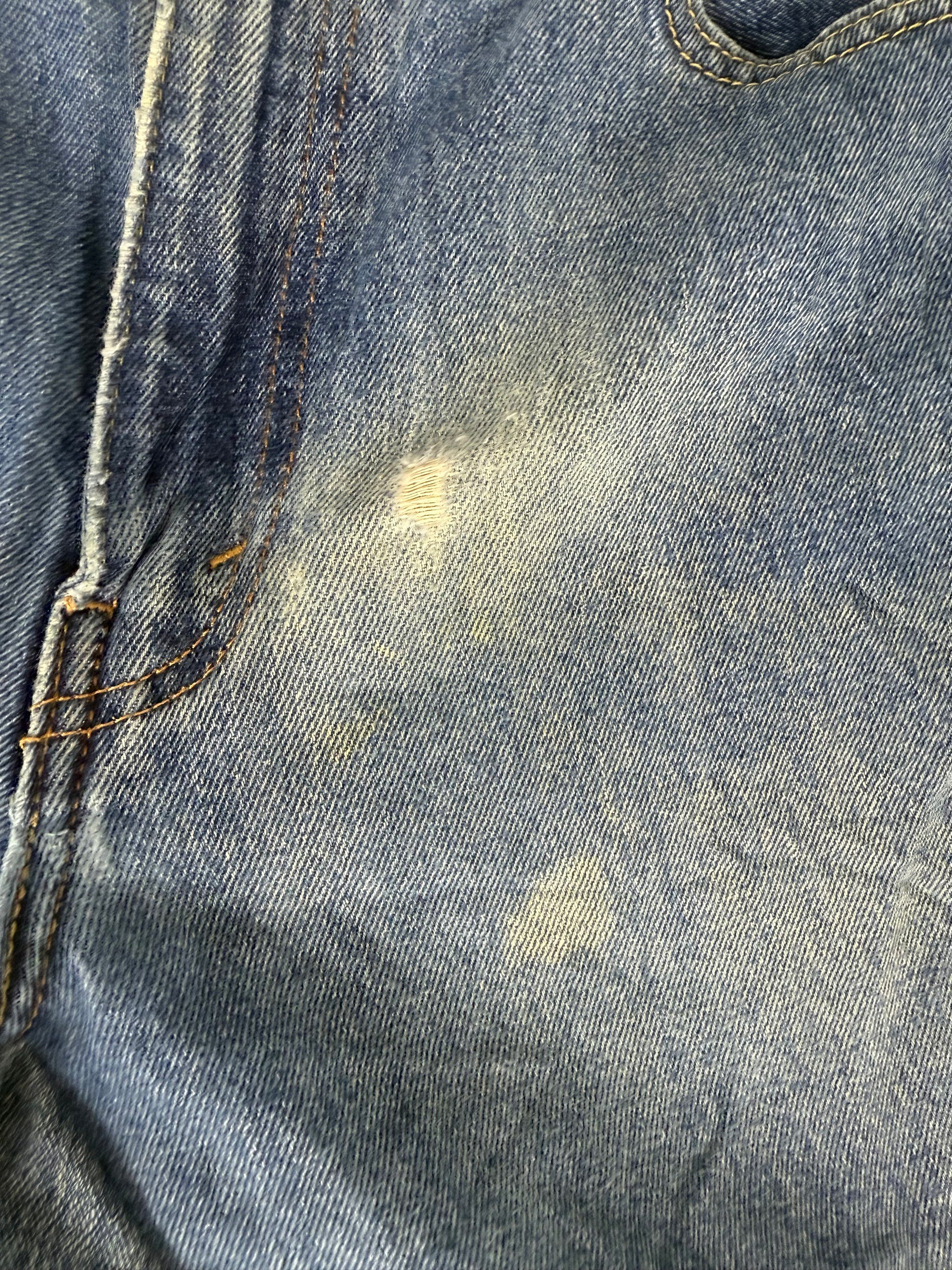 Les détails d’usure, comme les accrocs ou zones délavées, font partie intégrante du design et de l’ADN upcyclé du produit.